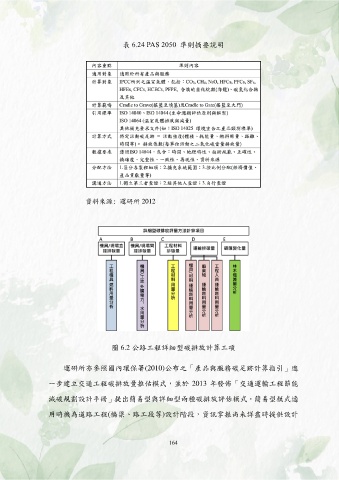 表 6.24 PAS 2050 準則摘要說明 資料來源: 運研所 2012 圖 6.2 公路工程詳細型碳排放計算工項 運研所亦參照國內環保署(2010)公布之「產品與服務碳足跡計算指引」進 一步建立交通工程碳排放量推估模式,並於 2013 年發佈「交通運輸工程節能 減碳規劃設計手冊」提出簡易型與詳細型兩種碳排放評估模式。簡易型模式適 用時機為道路工程(橋梁、路工段等)設計階段,資訊掌握尚未詳盡時提供設計 164