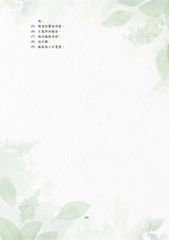 規。 (5) 環境影響説明書。 (6) 生態評估報告。 (7) 現況植物清冊。 (8) 設計圖。 (9) 植栽施工計畫書。 395