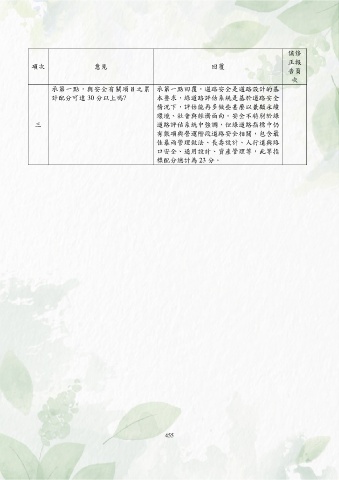 該修 正報 項次 意見 回覆 告頁 次 承第一點,與安全有關項目之累 承第一點回覆,道路安全是道路設計的基 計配分可達 30 分以上嗎? 本要求,綠道路評估系統是基於道路安全 情況下,評估能再多做些甚麼以兼顧永續 環境、社會與經濟面向。安全不特別於綠 三 道路評估系統中強調,但綠道路指標中仍 有數項與營運階段道路安全相關,包含最 佳暴雨管理做法、長壽設計、人行道與路 口安全、通用設計、資產管理等,此等指 標配分總計為 23 分。 455